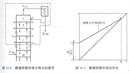 式(10—6)和式(10—9)皆稱為精餾段的操作線方程,其意義表示在一定操作條件下,精餾段內(nèi)任意兩塊相鄰塔板間,從上一塊塔板下降的液體組成與從下一塊塔板上升蒸汽組成之間的關(guān)系。其中式(10—9)用得比較普遍。