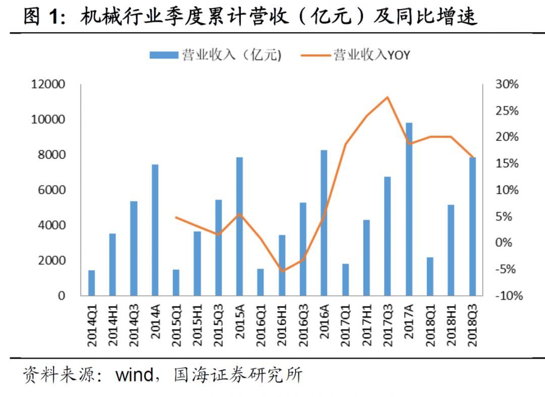 2016 年以來的行業(yè)復(fù)蘇進(jìn)程已到中場。我們梳理了331 家機(jī)械設(shè)備類企業(yè)的業(yè)績公告,2016年下半年機(jī)械行業(yè)整體收入增速由負(fù)轉(zhuǎn)正, 2017 年開始凈利潤亦隨之由負(fù)轉(zhuǎn)正,標(biāo)志著一輪新周期的開始。從增長率來看,2017 年形成了增長率的峰值;2018 年增速開始放緩,頭部特征明顯。預(yù)計(jì) 2019 年行業(yè)整體增速惡化,維持行業(yè)“中性”評級。