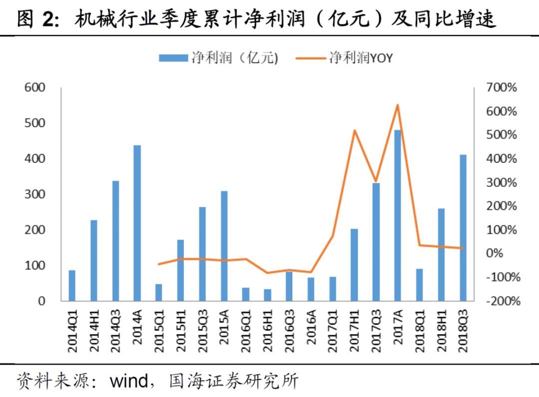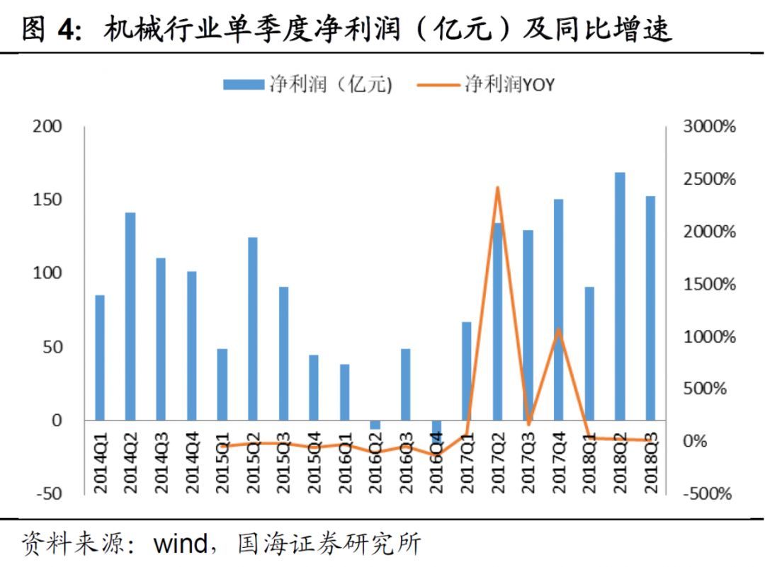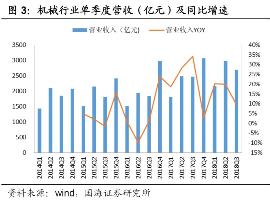 機(jī)械行業(yè)2018 年前三季度凈利潤同比增長21.72%,增速持續(xù)下滑。我們對331家機(jī)械設(shè)備類企業(yè)三季報(bào)進(jìn)行梳理,行業(yè) 2018 年前三季度累計(jì)實(shí)現(xiàn)營業(yè)收入8400.51 億元,同比增長 16.36%,其中一、二、三季度單季度收入同比增長分別為20.18%、19.75%、10.14%;前三季度累計(jì)實(shí)現(xiàn)凈利潤 476.13 億元,同比增長21.72%,其中一、二、三季度單季度凈利潤同比增長分別為29.19%、22.65%、 16.65%,行業(yè)三季度業(yè)績增速持續(xù)下滑。