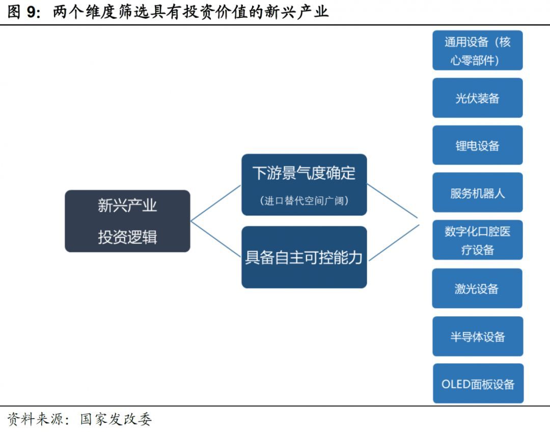 相對于傳統(tǒng)周期產(chǎn)業(yè),新興產(chǎn)業(yè)具備更大的增長潛力,代表著未來的發(fā)展方向。近年來以光伏、鋰電、無人機(jī)、服務(wù)機(jī)器人等諸多領(lǐng)域?yàn)榇淼男屡d產(chǎn)業(yè)快速發(fā)展,其核心技術(shù)具有國際競爭力,是《中國制造 2025》的倡議方向。但是,設(shè)備作為固定資產(chǎn)投資,在任何新興領(lǐng)域均有其周期屬性,因此我們需要從兩個(gè)維度篩選具有投資前景的新興產(chǎn)業(yè):一是下游需求景氣度確定向上(或者即使下游需求總量不變,但是進(jìn)口替代空間廣闊);二是具備自主可控能力。在此標(biāo)準(zhǔn)下,高端通用設(shè)備、光伏設(shè)備、半導(dǎo)體設(shè)備、激光設(shè)備、OLED 面板設(shè)備、服務(wù)機(jī)器人、數(shù)字化口腔醫(yī)療設(shè)備將是 2019 年的重點(diǎn)方向。