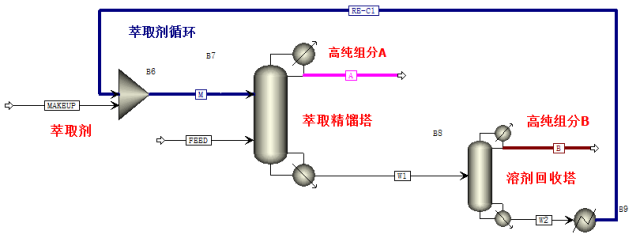 當(dāng)別分離組分間的相對揮發(fā)度很小或沸點相差很小,采用普通精餾可能無法進(jìn)行分離或需要塔板數(shù)非常多,可考慮萃取精餾,即加入某種高沸點的質(zhì)量分離劑(稱萃取劑)來增大組分之間的相對揮發(fā)度,以減少分離所需要的塔板數(shù)。萃取劑可通過普通精餾進(jìn)行回收,返回至萃取精餾塔循環(huán)使用。